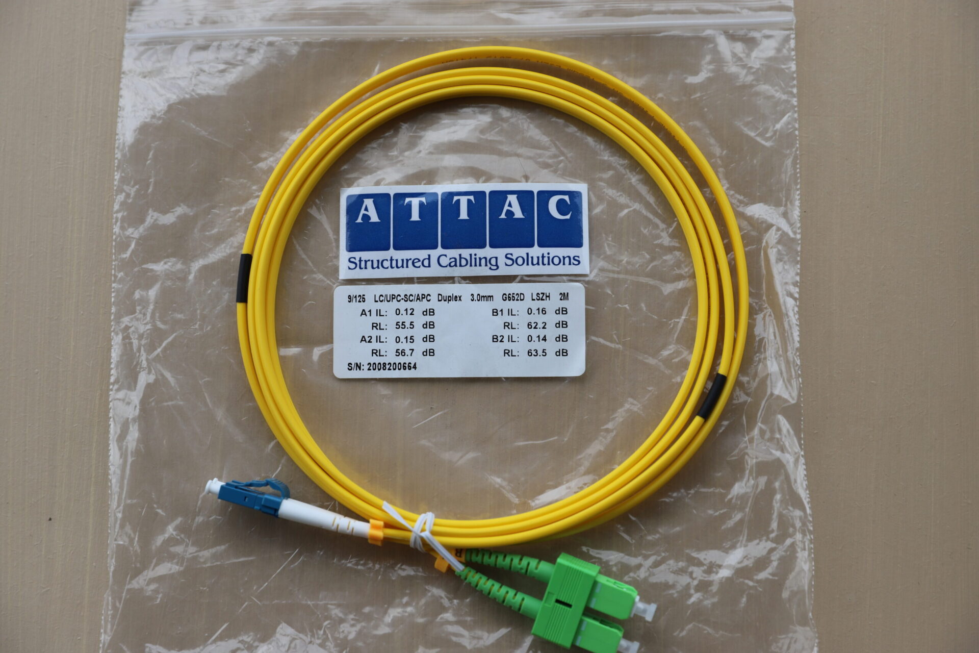 The 2 Metre LC/UPC to SC/APC Duplex Single-Mode Patch Lead from Attac is a professional-grade fibre optic solution tailored for high-performance network environments requiring cross-interface connections. Combining the flat-polished LC/UPC connector and the angled SC/APC connector, this patchcord ensures low insertion loss and minimal back reflection, making it ideal for FTTH, telecom infrastructure, data centres, and enterprise fibre networks.