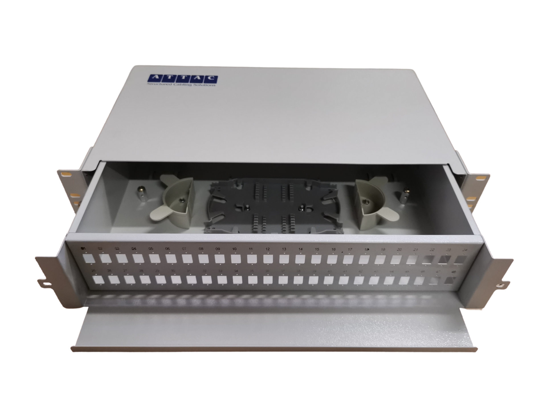 The Attac 48 Port LC Fibre Patch Panel (Sliding Type) is a high-capacity, rack-mountable solution for efficient fibre management in FTTH, enterprise networks, data centres, and telecom infrastructure. Designed for 19-inch racks, this sliding tray panel allows easy access to terminations, adaptors, and splicing areas, simplifying both installation and maintenance.