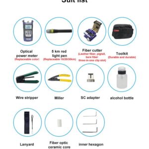 The optical power meter allows for accurate measurement of optical signal levels across various wavelengths, essential for network troubleshooting and performance verification. The included drop cable stripper simplifies the removal of jackets from FTTH drop cables, improving efficiency during splicing prep.